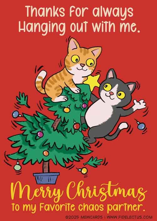 A pair of cats flirt merrily atop a Christmas tree that’s slowly tipping over, far too distracted by each other to notice the impending holiday tumble.