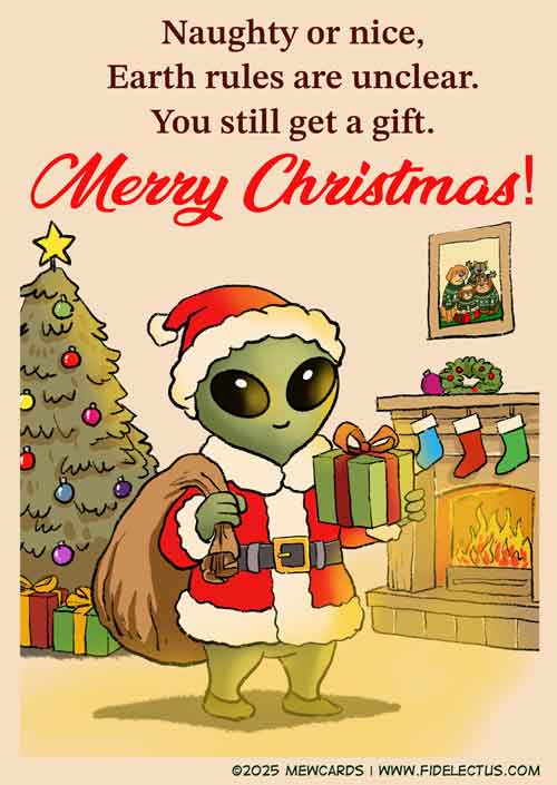 An alien dressed as Santa holds a sack of gifts and a single wrapped box, quietly processing the concept of “naughty” and “nice.” After careful evaluation, the rule remains unclear.